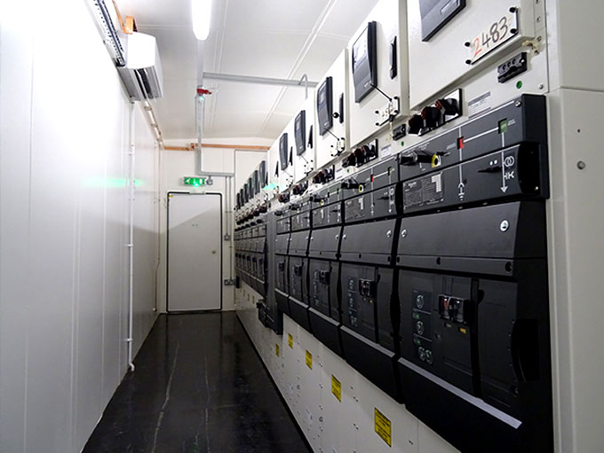 AJ Power also supplied a 13.8kV switchgear container. This air conditioned container is home to a common master control room where a SCADA Industrial PC Control System, also supplied by AJ Power, allows complete control and monitoring of all eight control panels and LS5 breaker controllers.